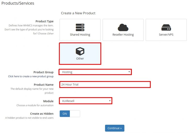 12. Fill in the above information. Make sure you select "XUIResell" as the module. Click Continue.