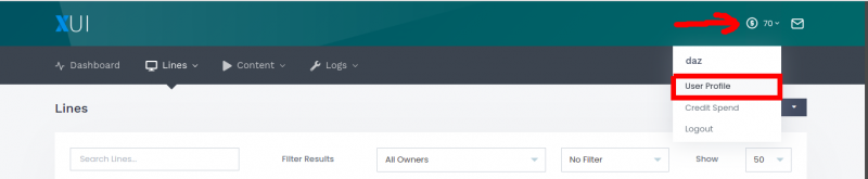 A Quick note for those of you that don't know where to get your XUI API key. Login to your XUI panel and click your credits icon on the right. From the dropdown click "User Profile"