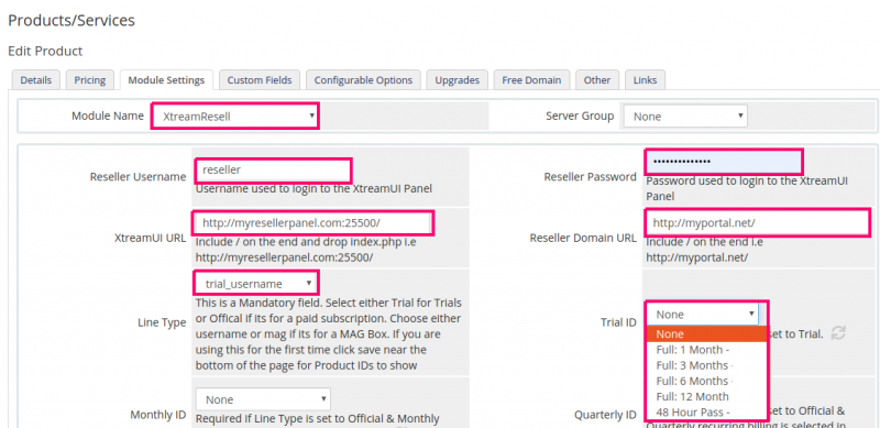 16. Fill in the below information. make sure you add a / of the end of your url's. If you are setting up a trial and wish to select all trial products from the panel select "trial_username". Click save. Your Trial products will now show in the drop down boxes